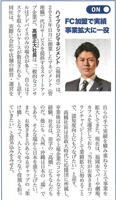 また、福岡市内で劇場・カフェを運営し、「当社がお客様のフランチャイジーとして業績拡大に努めることで、認知度向上にもつなげたい」という熱い想いや、社名に込めた理念についても取り上げられています。