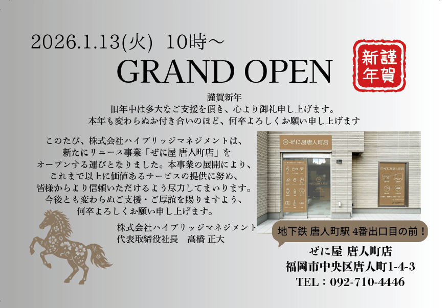 2026年1月13日(火)より弊社は従来のコンサルティング事業に加え、新たにFC事業を立ち上げ、その一号店として『ぜに屋 唐人町店』をオープンする運びとなりました。
